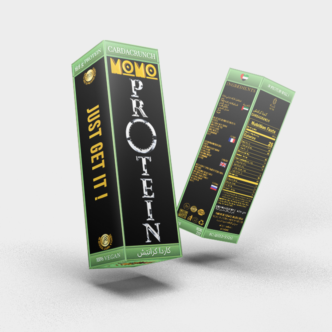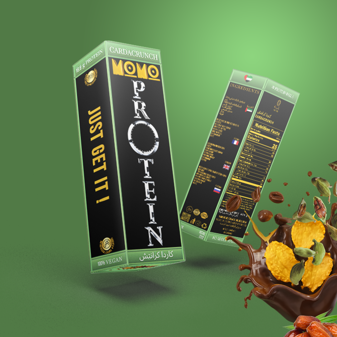 MOMO Protein Balls are packaged in eco-friendly, recyclable materials. The CARDACRUNCH flavor supports local agriculture and sustainable snacking, rooted in Dubai’s culture and values.