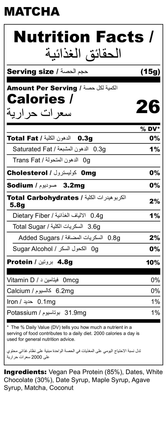 MOMO Protein Balls MATCHA unfold in layers: the earthy vibrancy of matcha, mellowed by naturally sweet dates and nutty coconut. Rich white chocolate adds a delicate creamy finish, while plant-based proteins ensure your treat is truly satisfying. Maple and agave syrups round out the flavor profile with just a hint of caramelized sweetness, creating balanced depth in every bite.