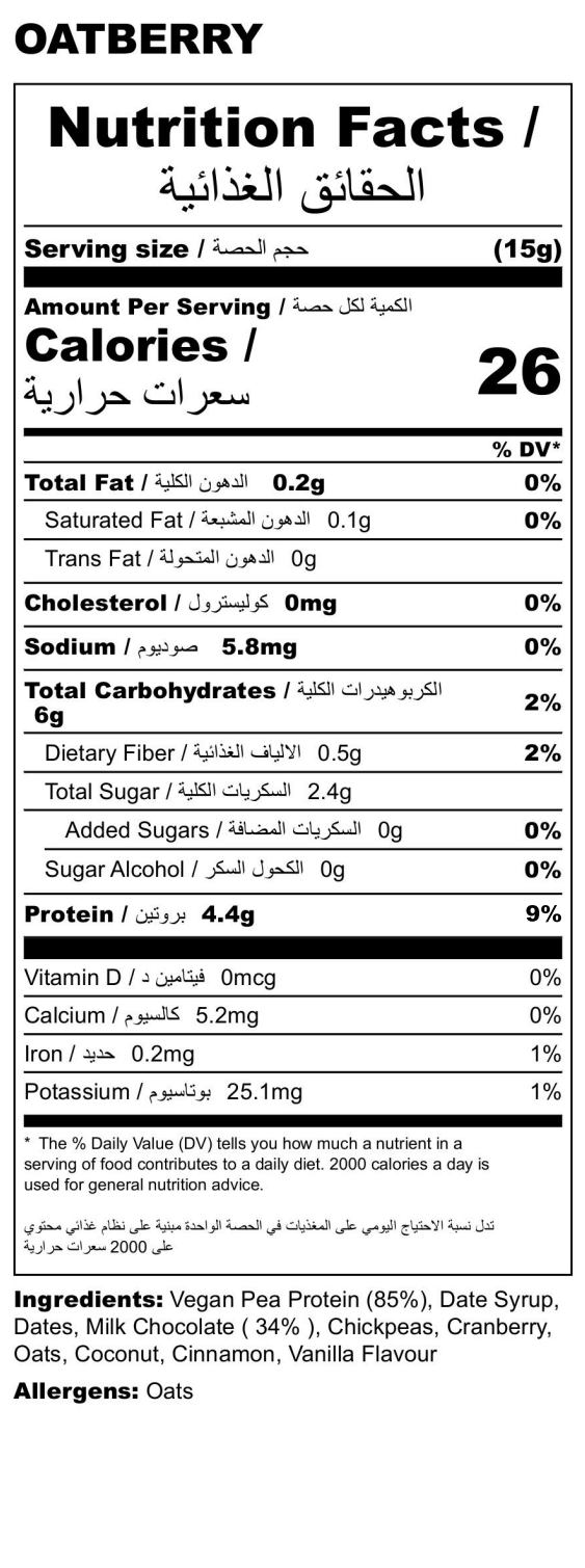 OATBERRY features chewy oats and chickpeas met with tart cranberries and creamy milk chocolate (34%). Aromatic vanilla and cinnamon enrich the experience, while coconut adds a soft, tropical undertone.