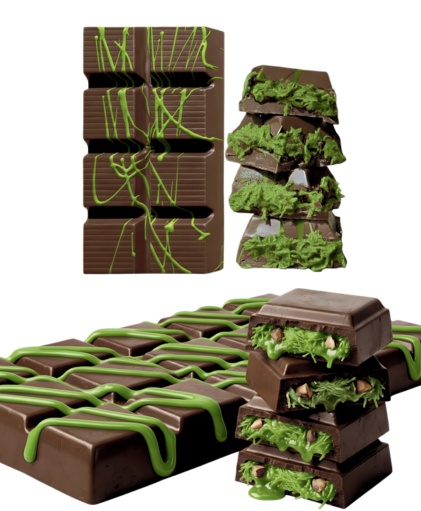 Pistachio: Indulge in the Pistachio Kunafa Chocolate Bar, made with 44% Dominican milk chocolate. Crispy kunafa meets creamy pistachio filling for a luxurious, melt-in-your-mouth treat. Perfect to enjoy yourself or share with someone special.