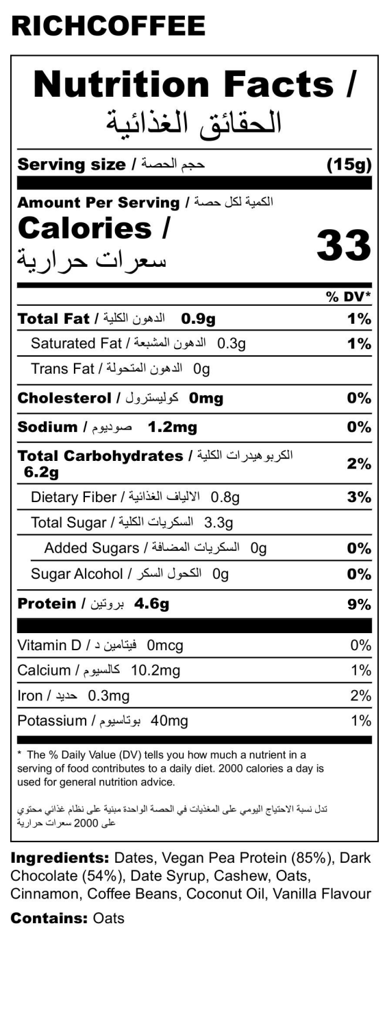RICH COFFEE is not just a snack—it's a celebration of coffee culture fused with smart nutrition. Meticulously crafted using premium ingredients, it captures the aromatic essence of freshly brewed coffee beans, enhanced with warm cinnamon, smooth vegan milk chocolate, and the balance of natural sweeteners. Whether powering through early mornings, mid-day slumps, or post-workout recovery, RICH COFFEE is designed to fuel body and mind without compromise.